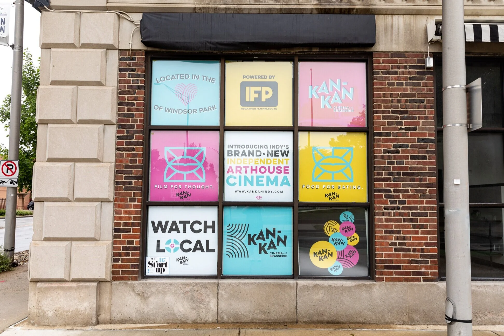 We loved the 9-paned windows of the Piccadilly building and given that our design and colors are eye-catching, designed, unique posters for every pane to promote the Kan-Kan Cinema and build awareness of who we are. Riffing off our brand as designed by Matinee Creative, our talented Communications Manager created nine unique signs. DCG printed them on reusable styrene and with a lot of duct tape, we mounted them in the windows.